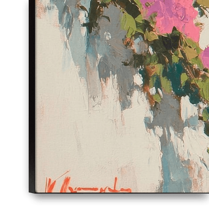 Een schilderachtig uitzicht op een idyllisch kustdorpje, waar glanzend witte muren en levendige blauwe koepels harmonieus samengaan met bloeiende bougainville. De zachte afbakening van de lucht weerspiegelt de rust van de zee en nodigt je uit om te dromen. Perfect voor de woonkamer, waar het vakantiegevoel en mediterrane charme…