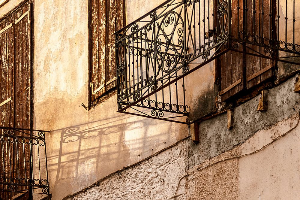 Dit is een typische Griekse sfeer. Het is laat in de middag, vroeg in de avond, de zon gaat onder, de laatste zonnestralen schijnen tegen de gele gevel van dit huis, met zijn bruine gesloten luiken. Er zijn twee balkonnetjes met zwarte ijzeren hekjes. Maar de vloeren van die balkonnetjes zijn weg. Waarschijnlijk ooit vermolmd en afgebroken. Je kunt dus niet het balkon op. Misschien woont er ook niemand. De luiken of louvres zijn oud en verveloos. Misschien staat deze bovenwoning leeg. Het is een fijne warme aanblik en straalt de rust van de zomer uit