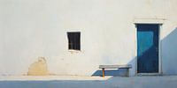 Grieks straatgezicht met schaduw is een digitaal schilderij dat een typisch Grieks straatbeeld afbeeld. Met de klassieke witte en blauwe elementen brengt u een stukje zomers Griekenland in huis.