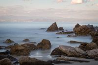 Foto van rotsen op het strand met de kustlijn van een Grieks schiereiland op de achtergrond. Deze foto is gemaakt met een lange sluitertijd waardoor het water gladder is dan normaal.