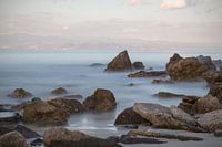 Foto van rotsen op het strand met de kustlijn van een Grieks schiereiland op de achtergrond. Deze foto is gemaakt met een lange sluitertijd waardoor het water gladder is dan normaal.
