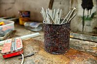 Griffels in roestige blik met doosje Samson bandenplakset.