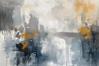 Abstract schilderij in grijs, blauw en goud met een serene maar krachtige uitstraling. Het werk past prachtig in Japandi, Industrieel en Modern Chic interieurs en voegt een luxueuze en verfijnde sfeer toe in woonkamer, eetkamer of kantoor. Een poëtische vertaling van balans tussen beweging en stilte, gevangen in tijdloze kleuren.