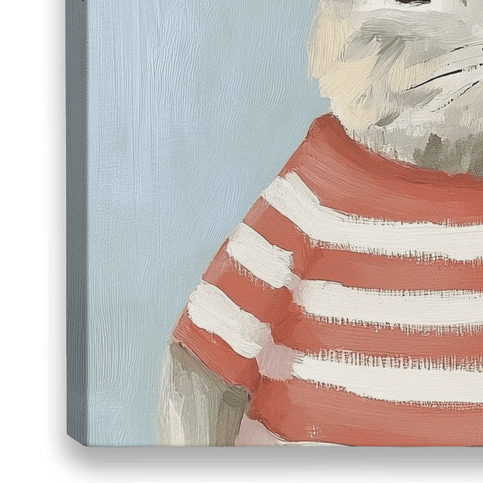 Grijs en wit konijn met kleding - Op dit dieren schilderij zie je twee schattige konijnen, één met een grijs vacht en een gestreept shirt, en de ander met een witte vacht en een roze shirt, op een zachte blauwe achtergrond.