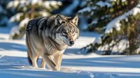 Een grijze wolf loopt door een besneeuwd landschap. Zonlicht creëert scherpe schaduwen. Groenblijvende bomen zijn zichtbaar in de onscherpe achtergrond.