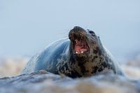 Een Grijze Zeehond dreigt naar rivaal in de branding aan zee.
