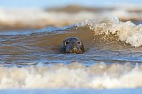 Een Grijze Zeehond steekt zijn kop op uit de branding aan de kustlijn van Engeland