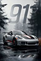 De Porsche 911 GT3 RS staat uitdagend in een mistig bos. De zilveren lak steekt af tegen de sombere, natte achtergrond en laat de agressieve aerodynamica aan de voorkant en het race-DNA goed tot hun recht komen. Het is een precisie-instrument dat is ontworpen om zowel de natuur als het circuit te bedwingen.