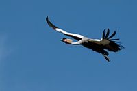 Grijze gekroonde kraanvogel, Balearica regulorum, nationale vogel van Oeganda met kroon van stijve gouden veren, vliegend tegen een blauwe lucht als achtergrond