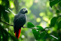 Een grijze papegaai met een felrode staart schittert tussen de weelderige groene bladeren. Zijn nieuwsgierige ogen fonkelen in het zachte licht terwijl hij nonchalant op een tak zit. De sfeer is levendig en mysterieus, alsof de vogel de geheimen van de jungle bewaart. Een fascinerend schepsel dat perfect past in zijn tropische omgeving.