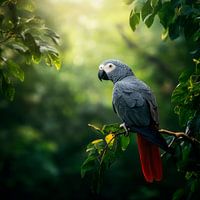 Een elegante grijze papegaai zit op een tak in het zachte licht van het bos. Zijn iriserende rode staartkleed steekt fel af tegen zijn grijs gevederde lichaam. Omringd door weelderig groen maakt hij een indruk van gratie en intelligentie terwijl hij aandachtig zijn omgeving bestudeert - een echte koning van de bomen.