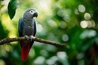 Temidden van weelderige, groene bladeren zit een elegante grijze papegaai. Zijn opvallende, felrode staartveren vormen een indrukwekkend contrast met zijn zachte, grijze verenkleed. De vogel kijkt aandachtig naar zijn omgeving, een prachtige ambassadeur van de jungle, vol leven en mysterie, die de magie van de natuur belichaamt.