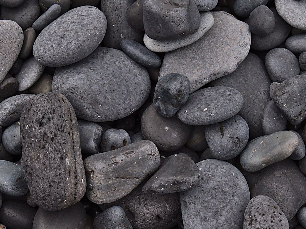Close-up van rondgeslepen, grijze stenen van vulkanisch gesteente op het strand van Djúpalónssandur aan de kust van het schiereiland Snæfellsnes in het westen van IJsland.