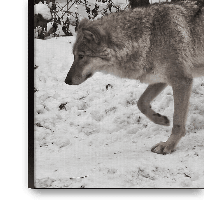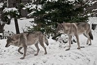 Koop dit landschapskunstwerk Grijze wolf op winterse witte sneeuw is een roofdier. Een paar wolven man en vrouw gaan vooruit. van Michael Semenov op canvas, aluminium dibond, (ingelijste) fotoprint, behang en ArtFrame, op maat geprint in Fine-Art kwaliteit.