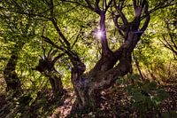 Tegenlicht opname van een grillig gevormde boom langs een wandelpad in Epen in het Zuid-Limburgse Heuvelland (Nederland).