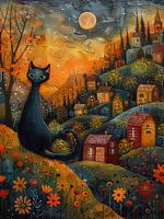 grillig schilderij van een zwarte kat op de heuvel onder de volle maan met het dorpje op de achtergrond