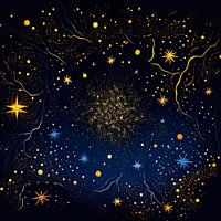 Een vectorillustratie in hoge resolutie met een effen zwarte achtergrond versierd met gouden sterren en speelse gele bliksemschichten. Aan de randen zorgen kleine lichtpuntjes voor een sprankelend effect en trekken ze de aandacht naar het midden, waar een sterrenhemelpatroon helder schijnt. De sterren worden omringd door lichtgevende,…