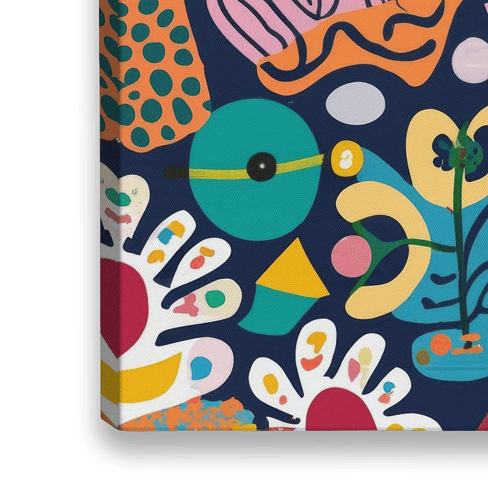 De afbeelding is een levendig en grillig abstract patroon tegen een donkerblauwe achtergrond. Het bevat een speelse mix van organische vormen die lijken op bloemen, koraal en bladeren, naast geometrische vormen zoals cirkels, driehoeken en strepen. Deze elementen worden weergegeven in een gedurfd en kleurrijk palet, waarbij roze,…