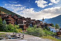Prachtige opname van het wintersport dorp Grimentz in de Zwitserse Alpen in de Val d'Anniviers vallei in het kanton Wallis in Zwitserland in de zomer met houten chalets de kerk