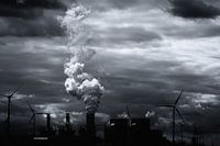 Een zwart wit foto van een grimmige energie landschap met donkere wolken en rookpluimen van vervuilende kolencentrales en groen alternatieve energie producerende windmolens.