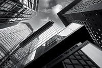 Uitzicht omhoog naar de kantoortorens in het centrum van Frankfurt.
