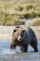 Een op zalm jagende grizzly beer lopend door de rivier