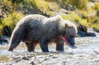 Grizzly beer met een gevangen rode zalm in haar bek.