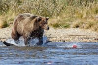 Grizzly beer die door de rivier loopt in het national Katmai Park in Alaska op zoek naar zalmen