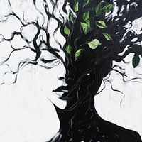 intrigerende en symbolische compositie waarin een vrouwelijk profiel versmelt met natuurlijke elementen. De linkerzijde van het gezicht wordt weergegeven in een zachte, realistische stijl, terwijl de rechterzijde en de hals overgaan in een netwerk van takken en bladeren. Het monochrome palet van zwart en wit zorgt voor een krachtig contrast, terwijl de heldere groene bladeren een levendig accent toevoegen en de compositie een organisch element geven.