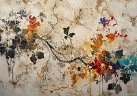 Groei - Het kunstwerk toont een dynamisch samenspel van botanische vormen, waarin de natuurlijke thematiek tot leven komt via een abstracte benadering. De contrasterende warme aardetinten en koele blauwe accenten zijn prachtig in balans en creëren een gevoel van beweging en groei. De textuur en druipende verf geven het stuk een organisch en ruw karakter.