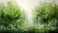 Verschillende schakeringen van groen, variërend van diepe smaragdgroen tot fris lentegroen, dansen met elkaar in een harmonieus samenspel. De penseelstreken lijken vrijelijk over het doek te bewegen, waardoor een gevoel van beweging en vitaliteit ontstaat.