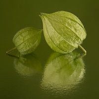 "Groen: Twee groene lampionnetjes in een groen vierkant" is een macrofoto van twee lampionnetjes van de lampionplant. Deze lampionnetjes zijn nog "jong" en zijn nog groen van kleur (Deze lampionnetjes zullen in de loop van de tijd verkleuren en een oranje kleur krijgen).