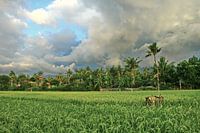 Regenwolken pakken zich samen boven Sawah's en bossen.