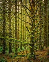 Een verticale 4:5 foto van de door oceaanvocht aangetaste bomen in Cape Sebastian State Scenic Corridor, een staatspark aan de westkust van de staat Oregon, beheerd door de Oregon Parks and Recreation Department.