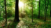 Dicht, groen bos in felle zonneschijn met een grote beuk op de voorgrond en veel verschillende jonge bomen op de achtergrond.