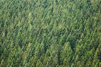 Een close-up van boomtoppen van een naaldbos in de Belgische Ardennen zorgt voor een abstract beeld