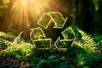 Een groen recyclingsymbool schittert op een betoverende open plek in het bos, omringd door levend mos en delicate varens. De zonnestralen breken door het bladerdak en geven het tafereel een warme, inspirerende sfeer. Dit kunstwerk is ideaal voor een woonkamer of kantoor om het bewustzijn van duurzaamheid en de nabijheid van de natuur te…