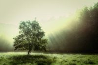 De ochtendzon breekt langzaam door de mist en onthult dit weiland met zijn solitaire boom in een dromerig ,fel verlicht tafereel