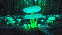 Een fascinerende foto van bioluminescente paddenstoelen in groen en blauw die de bosgrond in een magisch licht hullen. De donkere omgeving benadrukt de helderheid van de paddenstoelen en creëert een mysterieuze sfeer.