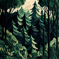 Deze indrukwekkende illustratie toont een dicht woud van groenblijvende bomen met donkergroen gebladerte en stammen met ingewikkelde patronen. Op de achtergrond vormen torenhoge bergen een gedurfd silhouet dat diepte en grandeur toevoegt. Met zijn sterke lijnen, geometrische vormen en contrasterende tinten combineert deze gestileerde…