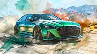 Een indrukwekkende poster van een groene Audi RS6 in schetsstijl straalt kracht en elegantie uit. De contouren van de auto zijn scherp getekend, terwijl de schetsmatige stijl een gevoel van beweging en dynamiek suggereert. De groene kleur springt van de pagina en vangt de aandacht, terwijl de schetslijnen de karakteristieke kenmerken van de RS6 benadrukken. Achtergrondelementen kunnen subtiel worden toegevoegd om de scène compleet te maken, waarbij de auto centraal staat en de kijker betovert met zijn krachtige uitstraling. Deze poster is een eerbetoon aan de iconische Audi RS6 en zijn tijdloze aantrekkingskracht.
