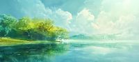 Groene Bomen - Dit is een modern landschap schilderij met een helderblauwe lucht, zachte witte wolken en groene bomen die weerkaatsen in een rustige, glanzende wateroppervlak, wat een gevoel van sereniteit en natuur oproept.