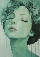 Details: Vrouwenportret, Hydrangea, Moderne Kunst, Rustige Uitdrukking, Gesloten Ogen, Groene Tinten, Portretschilderij, Dromerig, Mysterieus, Rococo Invloeden