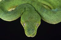Een portret van een Groene Hondskopboa. De Groene Hondskopboa komt voor in delen van Zuid-Amerika. Het is een typische boombewoner, die zich oprolt op een tak of boomkruin, en wacht op prooidieren. Overdag ligt de slang te slapen in een boom, en 's nachts wordt gejaagd op vogels en vleermuizen, maar ook wel hagedissen en kleine zoogdieren. Het is een van de snelste soorten boa's, niet alleen op het land, maar ook zwemmend in het water. De slang kan bijten en heeft scherpe tanden, maar is niet giftig.