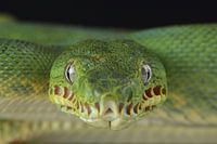 Een portret van een Groene Hondskopboa. De Groene Hondskopboa komt voor in delen van Zuid-Amerika. Het is een typische boombewoner, die zich oprolt op een tak of boomkruin, en wacht op prooidieren. Overdag ligt de slang te slapen in een boom, en 's nachts wordt gejaagd op vogels en vleermuizen, maar ook wel hagedissen en kleine…
