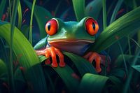 In de weelderige jungle schittert een groene kikker met grote, felrode ogen. Zijn glanzende groene huid past naadloos bij het omringende groen van de weelderige vegetatie. Hij zit op een blad, als een klein juweel dat deel uitmaakt van de schat van de natuur. Zijn rode ogen lijken op te lichten als lichtgevende edelstenen, waardoor hij een mysterieuze en betoverende uitstraling krijgt.