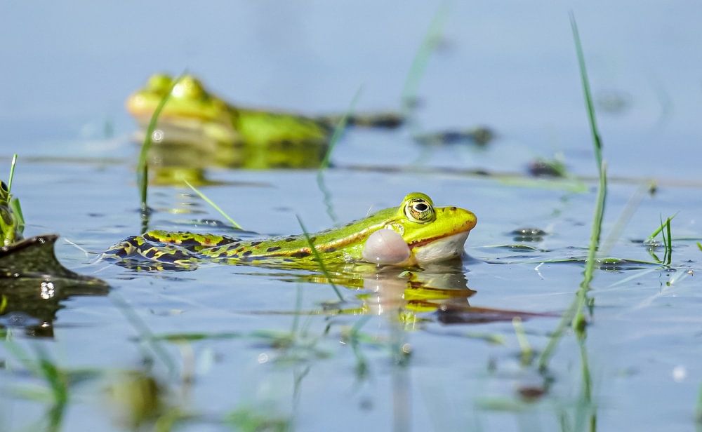 Deze levendige foto toont een groep groene kikkers die rustig in het water dobberen, omringd door riet en gras. De serene wateroppervlakte en de natuurlijke omgeving benadrukken de rust en schoonheid van het wilde leven. Perfect voor liefhebbers van natuur en dierenfotografie.