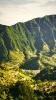Deze foto toont de weelderige, groene natuur van Madeira, met varens, tropische bomen en kabbelende watervallen. Het beeld vangt de magie van het oerwoud, waar zonnestralen door het bladerdak vallen en kleine druppeltjes water schitteren in het licht. Kleine details zoals de kronkelende beekjes, mosbedekte rotsen en het spel van…