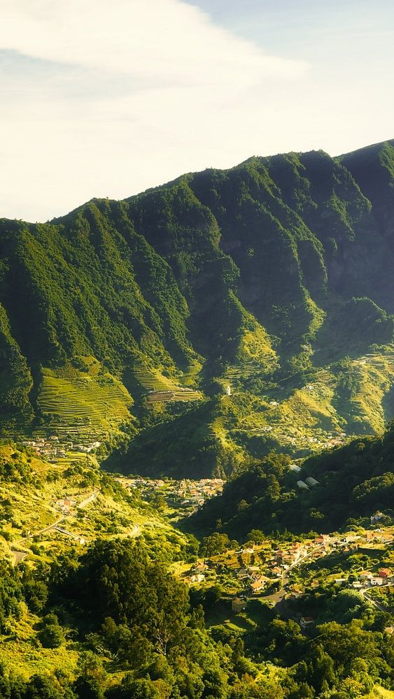 Deze foto toont de weelderige, groene natuur van Madeira, met varens, tropische bomen en kabbelende watervallen. Het beeld vangt de magie van het oerwoud, waar zonnestralen door het bladerdak vallen en kleine druppeltjes water schitteren in het licht. Kleine details zoals de kronkelende beekjes, mosbedekte rotsen en het spel van…