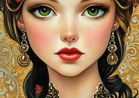 Groene Ogen | Meisje met Grote Groene Ogen - Op dit vrouwen schilderij zie je een meisje met grote groene ogen en opvallende gouden oorbellen, tegen een decoratieve achtergrond in warme tinten.